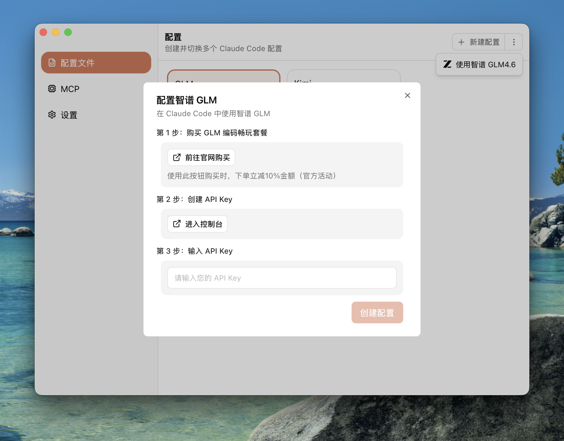 最简单的方法是使用我最近做的 CC Mate 这个小工具。安装好 Claude Code 后,在 CC Mate 填一下 API Key, 所有的配置都会帮你处理好,这时打开 Claude Code 就已经是在使用 GLM 了。